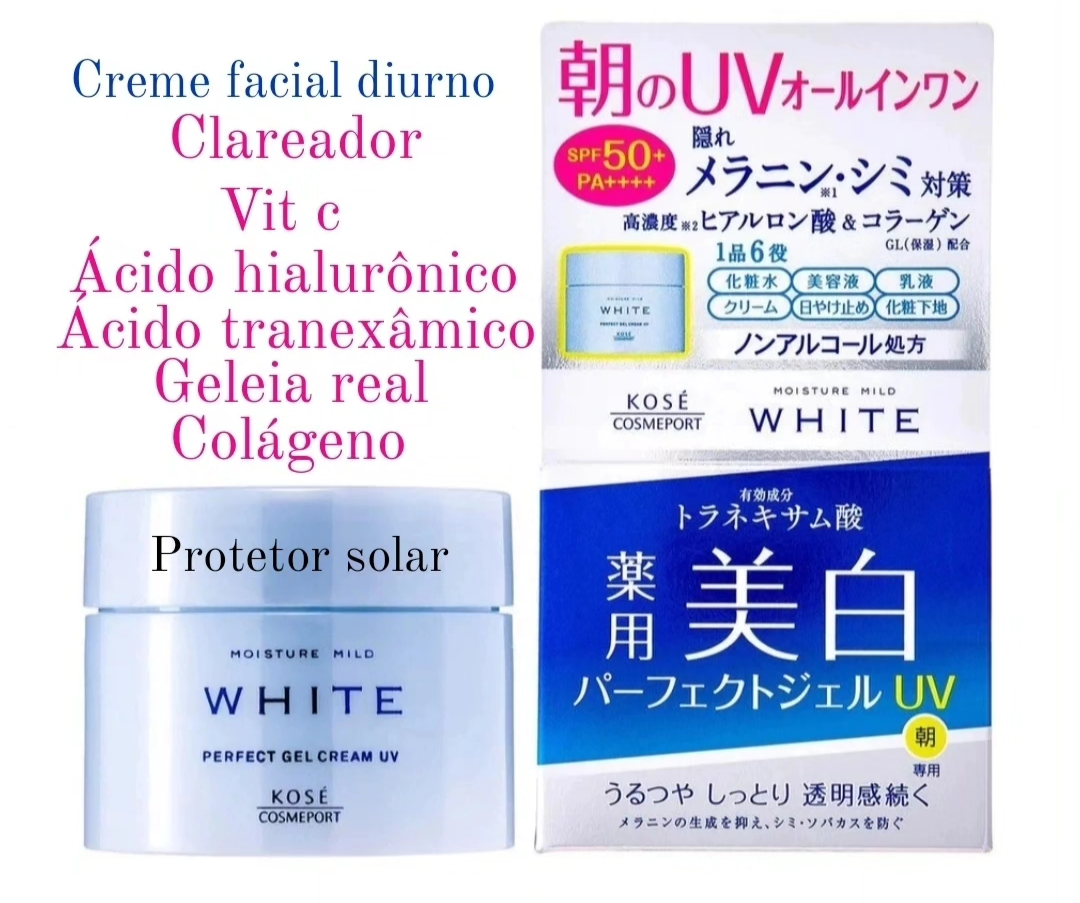 Contém na sua fórmula ácido tranexamico , colágeno, protetor solar SPF 50+ PA ++++